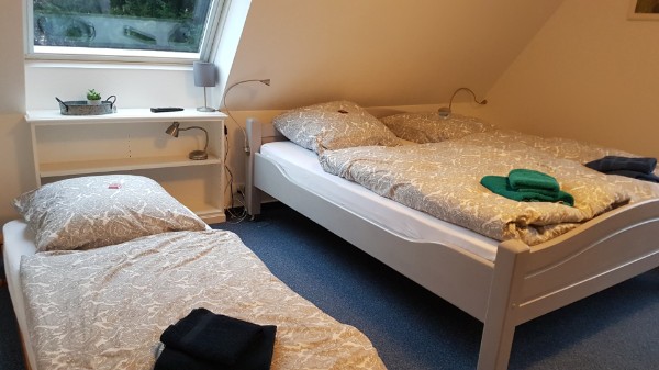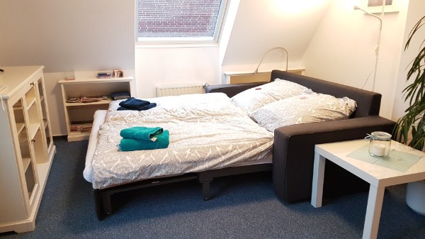Im Hintergrund ist die Tür zu sehen, die zu der kleinen Abstellkammer führt | . | Das Zustellbett im Schlafzimmer hat die Maße 0,9 x 1,9 mtr. |