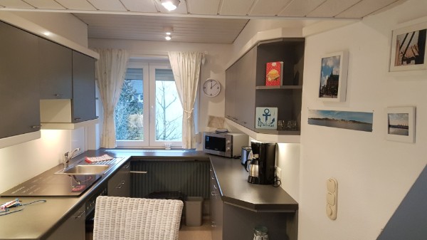 | Hier kann man sehr gut mit 4 Personen sitzen. Über dem Tresen sorgt die dimmbare Beleuchtung für die richtige Atmosphäre. | | Die Küche ist umfangreich ausgestattet und bietet viel Schrankraum Im Kühlschrank stehen Wasser und Saft für den ersten Durst. |